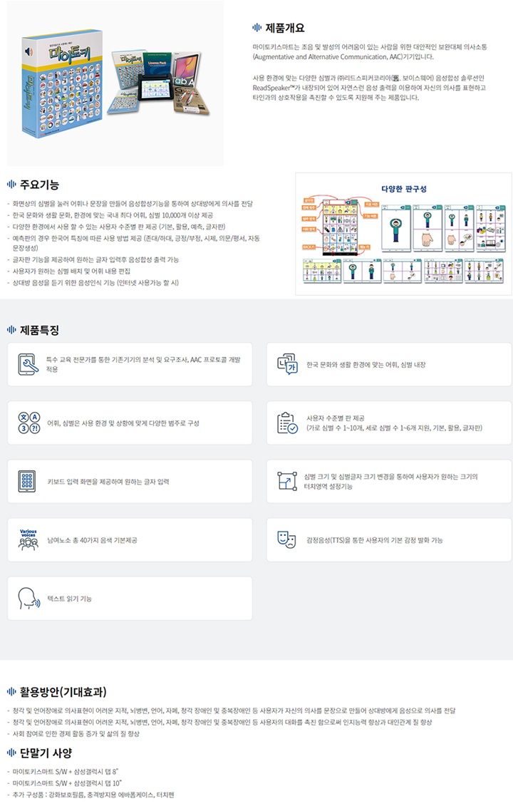 HOME > 보조공학기기 > 의사소통 및 훈련보조기기 > 언어훈련기기(11) > 마이토키스마트